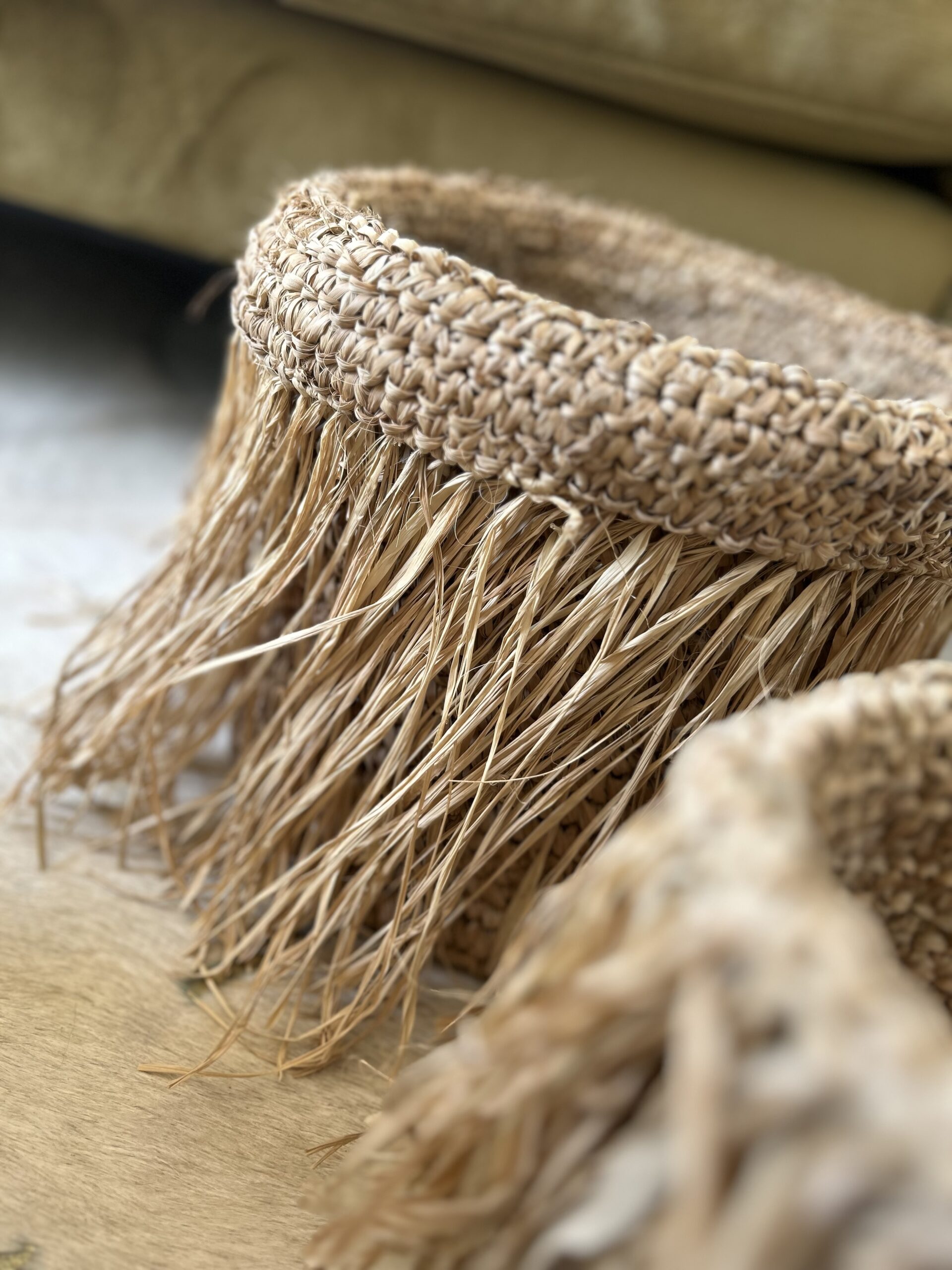 Deze set van 3 handgevlochten manden met speelse raffia-franjes is de ultieme sfeermaker voor jouw boho interieur. Elke hoek wordt er instant gezelliger van.